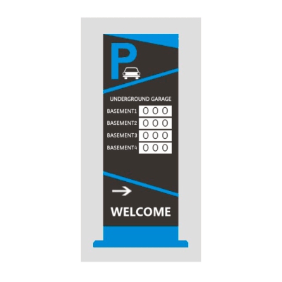 Экран навигации | Отображает приветственные сообщения и информацию об оставшемся месте на этаже всей парковки | Пиксельный состав модуля: 1R1G Двухцветный | Количество модулей: 4 | Интерфейс: Ethernet 1×RJ45 10M/100Mbps / 1×RS485 / 1×RS232 | Расстояние связи: 1200м (последоват. порт) / 120м (сетевой кабель) | Цвет: Черный/Синий | Питание: АC 110-220V | Размер: 150×700×2200мм / 320×160мм (модуль)
