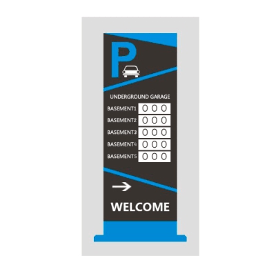 Экран навигации | Отображает приветственные сообщения и информацию об оставшемся месте на этаже всей парковки | Пиксельный состав модуля: 1R1G Двухцветный | Количество модулей: 5 | Интерфейс: Ethernet 1×RJ45 10M/100Mbps / 1×RS485 / 1×RS232 | Расстояние связи: 1200м (последоват. порт) / 120м (сетевой кабель) | Цвет: Черный/Синий | Питание: АC 110-220V | Размер: 150×700×2400мм / 320×160мм (модуль)