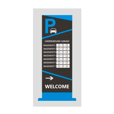 Экран навигации | Отображает приветственные сообщения и информацию об оставшемся месте на этаже всей парковки | Пиксельный состав модуля: 1R1G Двухцветный | Количество модулей: 7 | Интерфейс: Ethernet 1×RJ45 10M/100Mbps / 1×RS485 / 1×RS232 | Расстояние связи: 1200м (последоват. порт) / 120м (сетевой кабель) | Цвет: Черный/Синий | Питание: АC 110-220V | Размер: 150×700×2800мм / 320×160мм (модуль)