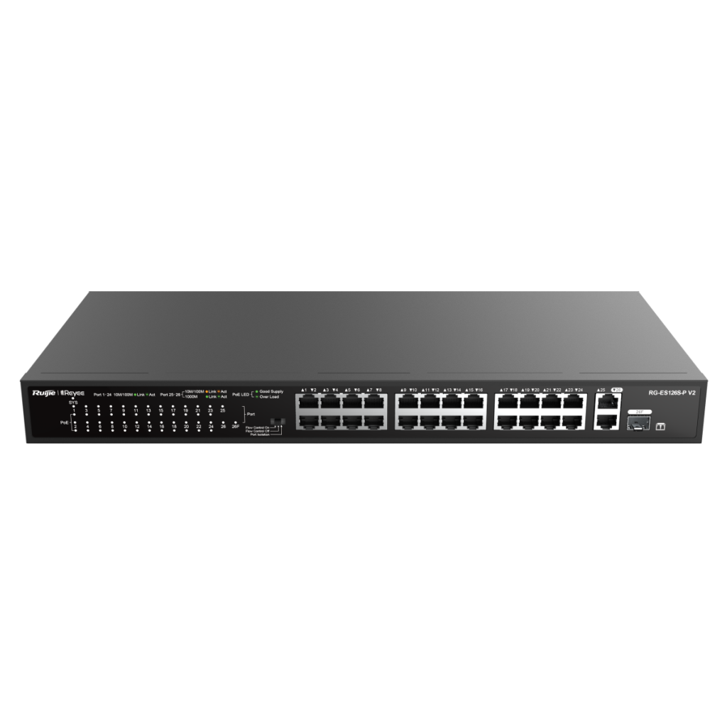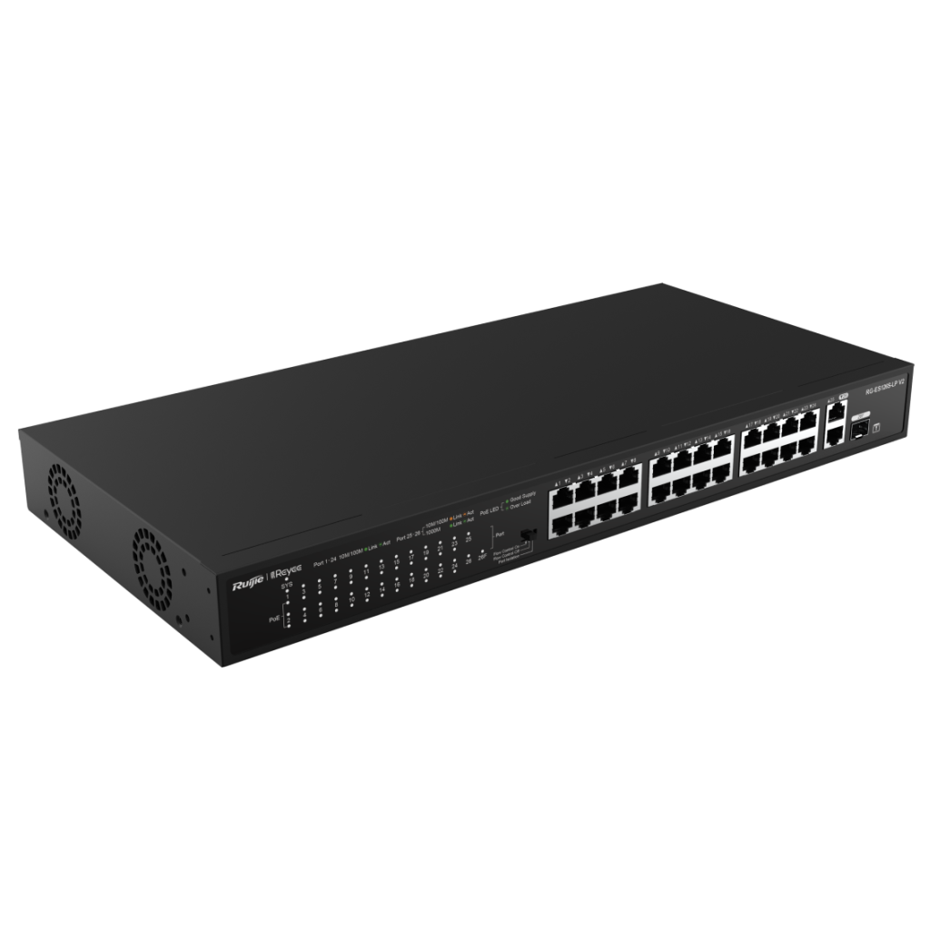 PoE Коммутатор, облачный | Уровень: Неуправляемый | Интерфейс: PoE 24×RJ45 10/100Мбит/с / Uplink 1×RJ45 1Гбит/с / Uplink Combo 1×RJ45 1Гбит/с + 1×SFP 1Гбит/с | Протоколы: Auto/Full/Half Duplex Negotiation, Auto MDI/MDIX, Flow Control, Port Isolation | PoE Стандарт: IEEE 802.3af/at | PoE Бюджет: 370W | Скорость коммутации: 8.8Гбит/с | Скорость передачи пакетов: 6.55Мбит/с | MTBF: >200'000 часов | Охлаждение: Активное | Типоразмер: Настольный | Материал: Металл | Степень защиты: ESP TVS 6000V Защита от перенапряжения до 6kV | Питание: AC 100V~240V 4A 220W | Температура: 0°C...+45°C | Вес: 3кг | Размер: 440×208×44мм
