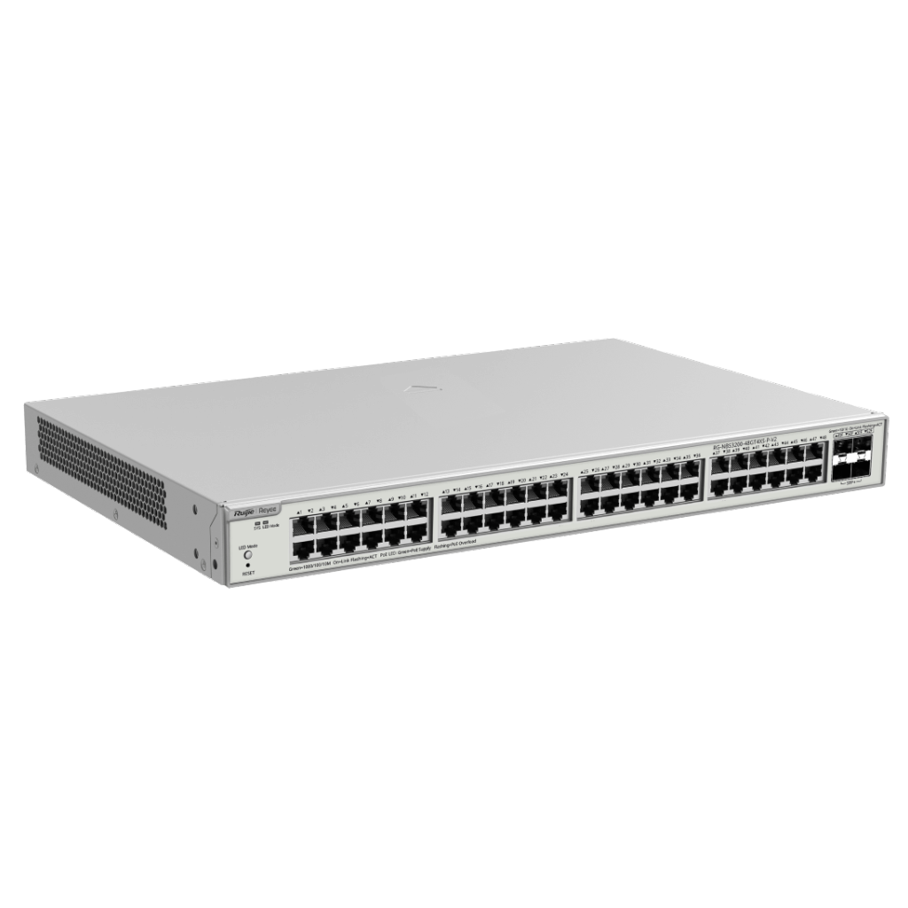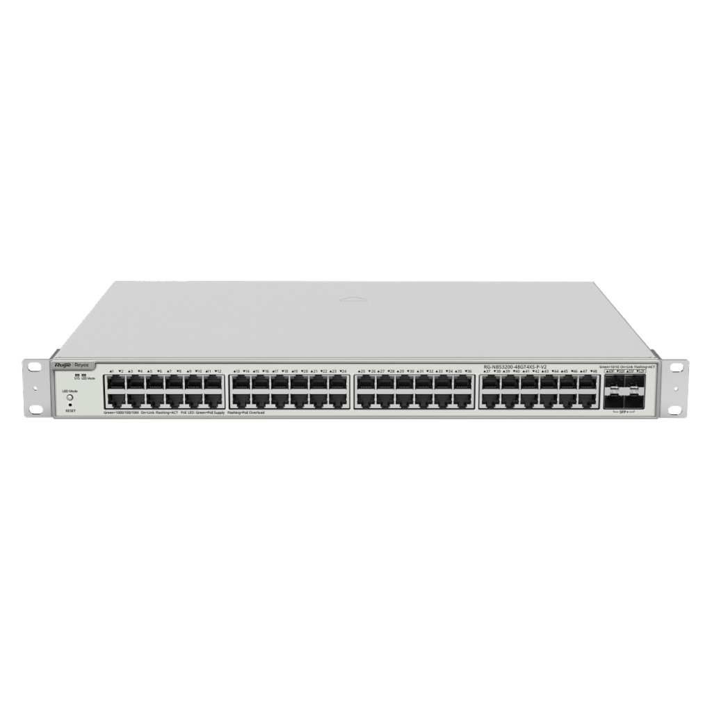 PoE Коммутатор | Уровень: L2+ Управляемый | Интерфейс: PoE 48×RJ45 1Гбит/с / Uplink 4×SFP+ 10Гбит/с | Протоколы: STP/RSTP, Voice VLAN, IGMP Snooping v1/v2, CPP, EEE, Syslog | PoE Стандарт: IEEE 802.3af/at | PoE Бюджет: 370W | Скорость коммутации: 176Гбит/с | Скорость передачи пакетов: 130.95Мбит/с | MTU Кадр сети Ethernet: 9216Байт | LAG Агрегация каналов: 16 групп | ACL Список управлением доступом: 1900 правил | Облачное управление: Ruijie Cloud | Автоматическое аварийное восстановление устройства | MTBF: >200'000 часов | Охлаждение: Активное | Типоразмер: Настольный | Материал: Металл | Степень защиты: ESP TVS 6000V Защита от перенапряжения до 6kV | Питание: AC 100V~240V 7A 448W | Температура: 0°C...+50°C | Вес: 5.4кг | Размер: 440×357.6×43.6мм