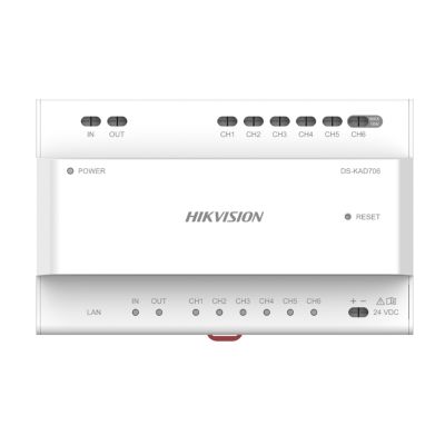 IP Домофон, коммутатор адресный | Интерфейс: Ethernet 1×RJ45 10M/100Mbps / 8×2-проводная коммутация (IN/OUT для DS-KAD704Y/DS-KAD706Y/DS-KAD706Y-S, CH1-CH6 для устройств) / 8×Индикатор сигнала / 1×Питание | Reset Кнопка сброса настроек | Инсталляция: DIN Рейка | Цвет: Белый | Применение: Внутреннее | Питание: DC 24V 6W / CH6 - 16W | Температура: -10°C...+55°C | Размер: 143.7×90×65.9мм