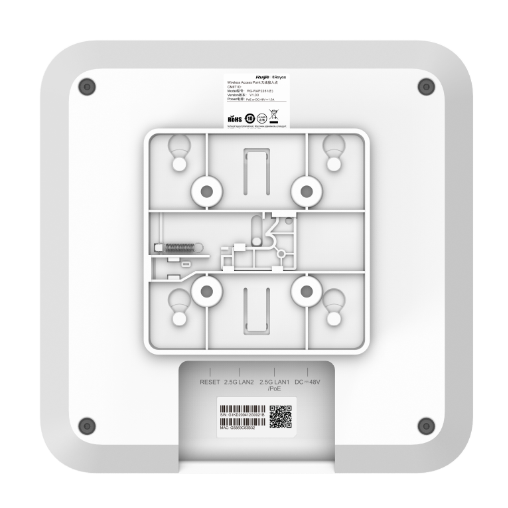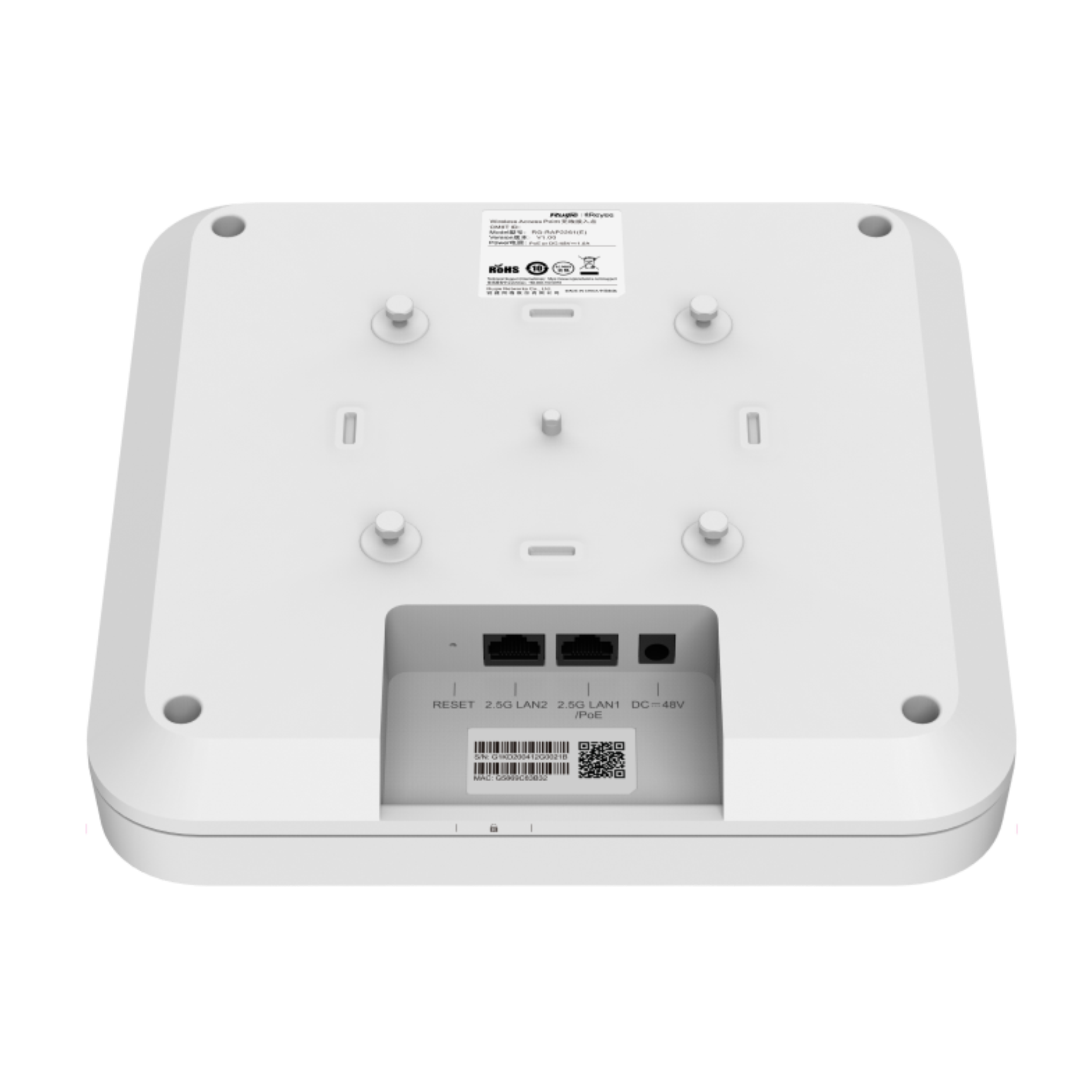 WiFi Точка доступа | Скорость: 5952Mbps | STA Подключения: до 512 устройств | WiFi Радиус покрытия: до 150 метров | Интерфейс: LAN 2×RJ45 2.5Gbps (LAN1 поддерживает PoE) / Wi-Fi 2.4GHz IEEE802.11 b/g/n/ax 1148Mbps и 5GHz IEEE802.11a/n/ac/ax 4804Mbps | Протоколы: PPPoE, DHCP, Free Cloud Management, Self-organizing Network | Антенна: 8×MU-MIMO Встроенная / Усиление: 2.4GHz: 3dBi, 5GHz: 4dBi | Облачное управление: Ruijie Cloud | MTBF: >400'000 часов | Reset Сброс настроек | Типоразмер: Настенный | Цвет: Белый | Питание: DC 48V 1A ≤40W / PoE IEEE 802.3bt | Температура: 0°C...+40°C | Размер: 230×230×49.5мм